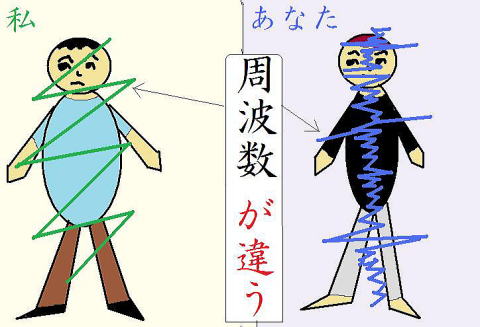同じ人間という生き物であっても、上図のように、1人1人、当然、周波数に超微妙に個体差が存在しており、その個体差に応じて引き寄せの法則が働き・・同じような人間同士で引かれ合っているようです。