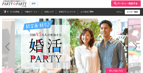 上場企業IBJが運営するお見合いパーティーの老舗【PARTY☆PARTY】は、月間動員数20,000名以上、月間カップリング数 3,000組以上の実績があります。