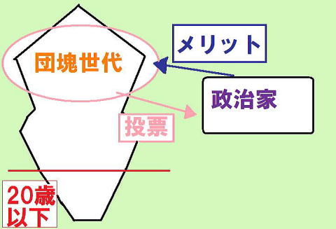 人数も多く、投票率も高い段階世代が「老人に手厚い保護を保証する政党/政治家」に投票を行うため、「老人に手厚い保護を保証する政策」をとる政党や政治家が政権を握ることも予想されます。