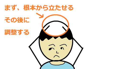 頭の形や、髪型にもよりますが、基本的には、サイド(耳の近くや耳の上)は触らず、頭頂部から前髪までのラインを立たせていきます。