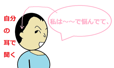 しかし、誰かに話すと、話すことで{自分の問題/悩み}を耳から(客観的に)聞くことになり、問題が整理されて、問題が客観視できるようになり、すると自ら問題の解決策や解決案も閃いてきます。