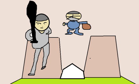 @毎回、同じ動作(バットをくるっとまわして、立てる)