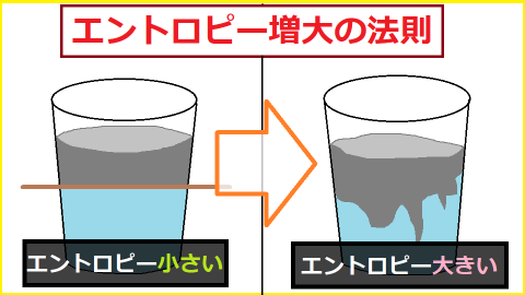 エントロピー増大の法則とは「物事は放っておくと乱雑・無秩序・複雑な方向に向かい、自発的に元に戻ることはない」という法則です。