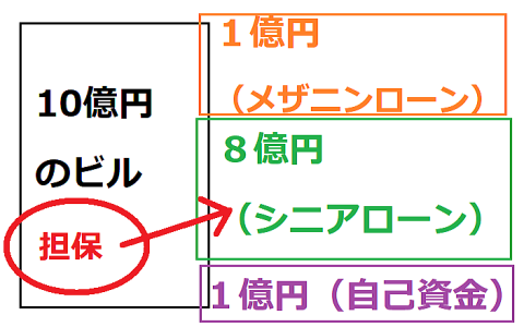 例えば、銀行がシニアローンで5億円を貸しており、残り3億円をメザニンローンでソーシャルレンディングの会社が貸している場合。