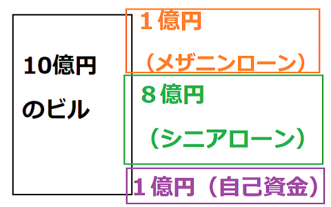 例えば、収益ビルの評価額が10億円の場合、シニアローンとメザニンローンを合わせて10億円以内の融資にするわけですね。