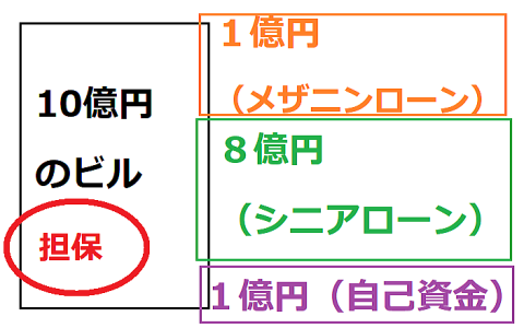 自己資金1億円、銀行のシニアローンが6億円の場合、物件評価額10億円以内におさまるよう3億円までしかメザニンローンで貸さないわけです。