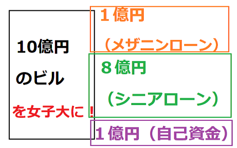 この例だと、4億円をメザニンローンで融資するので、6億円程度を、銀行からシニアローンで借りていることでしょう。