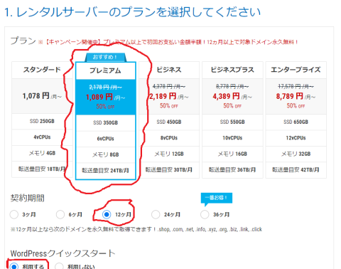 公式サイトにいって「プレミアムプラン」を選び「契約期間」は12カ月を選択して、「wordPressクイックスタート」は利用するを選択します。