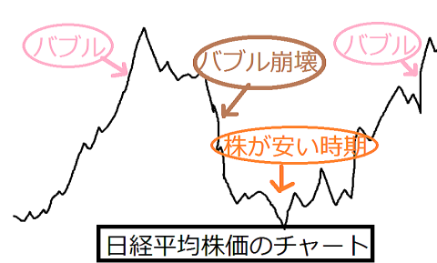 バブル崩壊後の不景気の時期(株価低迷期)には、株価も下がっているため、株を安く買えるチャンスです。