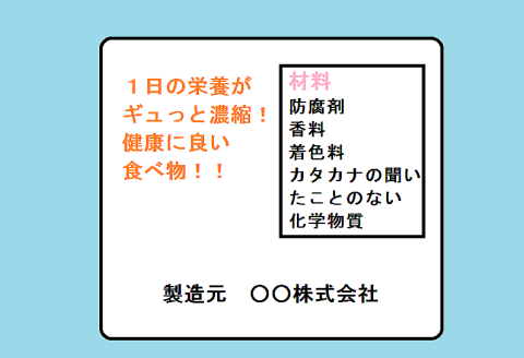 「この魔法の粉(食品添加物(化学物質))を入れると、味が美味しくなるから」「この魔法の粉(食品添加物(化学物質))を入れると、保存がきくから」などの理由より、食品添加物が、ありとあらゆる食品に使われているそうです。
