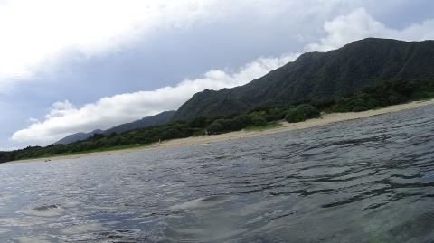 写真は海から米原ビーチを撮ったものです。水深は膝下や腰くらいまでの深さでした。ちなみにリーフエッジは、もっともっと沖にあります。