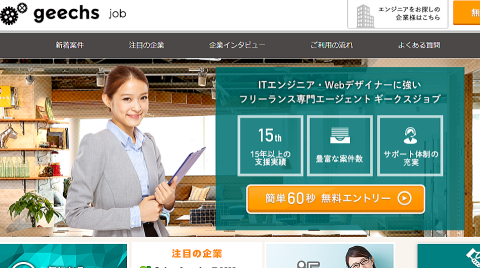 フリーランス・フリーエンジニアの登録数が7,500名を超える、案件検索サイト「ギークスジョブ」です。