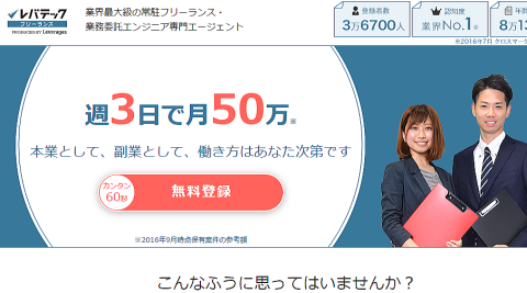 レバテックフリーランスは登録したフリーランス(個人事業主)のエンジニア、デザイナーにWeb系を中心とした案件情報を提案しています。